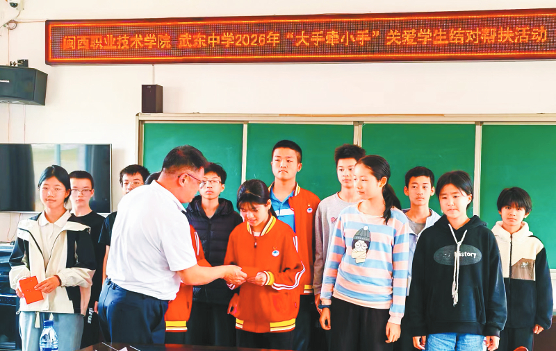 为深入践行“我为群众办实事”,助力乡村教育提质增效,闽西职业技术学院联合爱心企业,连续5年走进武平县武东中学,开展“大手牵小手,关爱助成长”结对帮扶活动,为乡村学子送去温暖与希望。图为2026年发放助学金现场。通讯员 余换新 摄