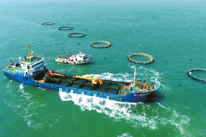 4月10日,山东青岛西海岸新区鲁海丰海洋牧场2026年首批10万尾鱼苗投入深水网箱进行养殖。据悉,青岛鲁海丰海洋牧场地处国家一类水质海域,水温适宜、盐度均衡,比较适宜海鱼生长。图为作业船只准备停靠山东青岛西海岸新区鲁海丰海洋牧场。 新华社发 俞方平 摄