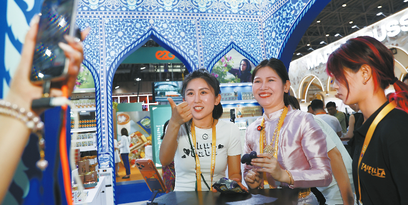 4月13日,主播在第六届消博会一处海外商品展台直播。当日,第六届中国国际消费品博览会在海南举办。本届展会是海南自贸港全岛封关运作后的首届国家级消费盛会,以“开放引领全球消费,创新驱动美好生活”为主题,汇聚了来自60多个国家和地区的超过3400个品牌参展,搭建起全球消费精品展示交易的国际化平台。新华社记者 高静 摄
