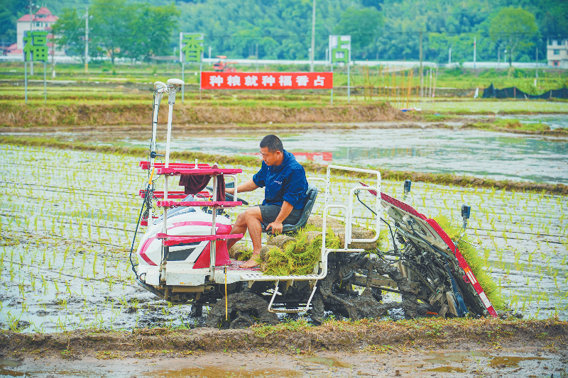 新罗区雁石镇厦中村,村民正在驾驶插秧机在田间来回穿梭。龙媒体记者 章宸睿 黄银洁 摄