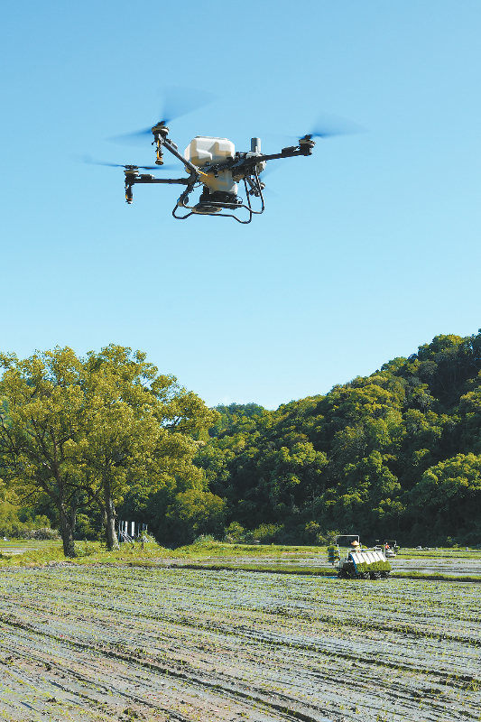 上杭县中都镇省劳模工作室基地里,无人机凌空为秧苗追肥。 通讯员 杨国鑫 摄