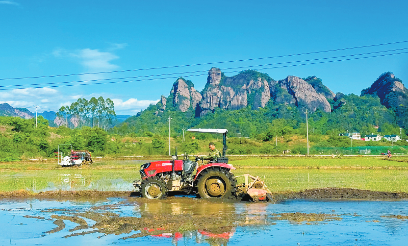 连城县揭乐乡林翔家庭农场,连片稻田里农机轰鸣作业,一派火热景象。 龙媒体记者 章宸睿 通讯员 黄水林 摄