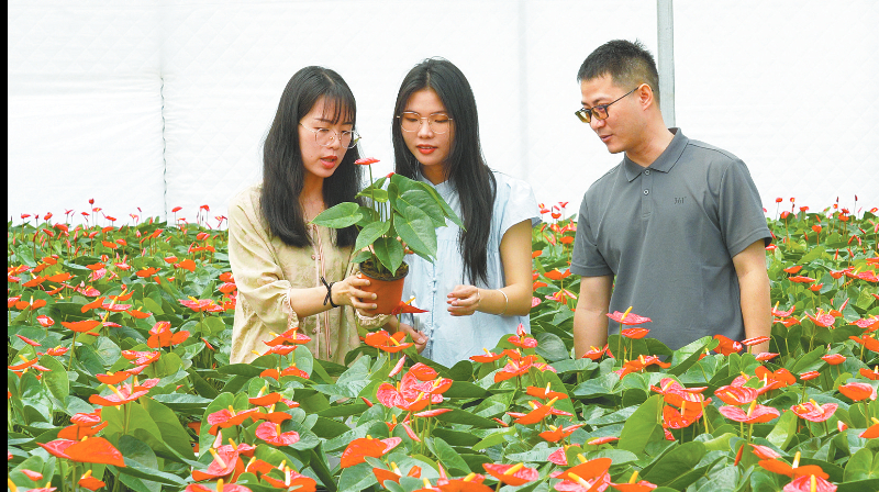 4月17日,笔者走进永定区龙潭镇的广龙共富花场。1.1万平方米的智能温室大棚空间里,整齐的红掌长势喜人。