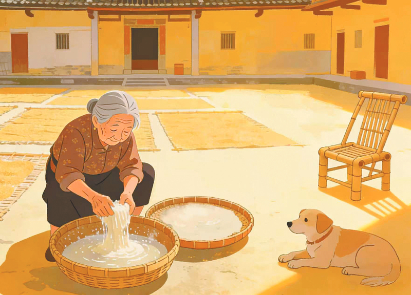 也不知坐了多久,望了多久,神游了多久,当我从围屋正堂出来,围屋禾坪里,一位阿婆正忙着清洗蕉芋粉。阳光照着她沧桑的脸,没有一丝慌乱。那是岁月沉淀下来的从容。你看她,一遍又一遍清洗,一簸箕一簸箕晾晒,忙而不乱,有条不紊。她已不再年轻,但静守围屋,静候时光流逝,生命,对她来说已是一个完满。再看那段天井,那把包浆的竹椅,还有那只慵懒的狗,在光影里,充满了乡愁的味道。你会默然感慨,在时光的长河中,美好的事物,总是默默地坚守着它的风姿,任人遐想。